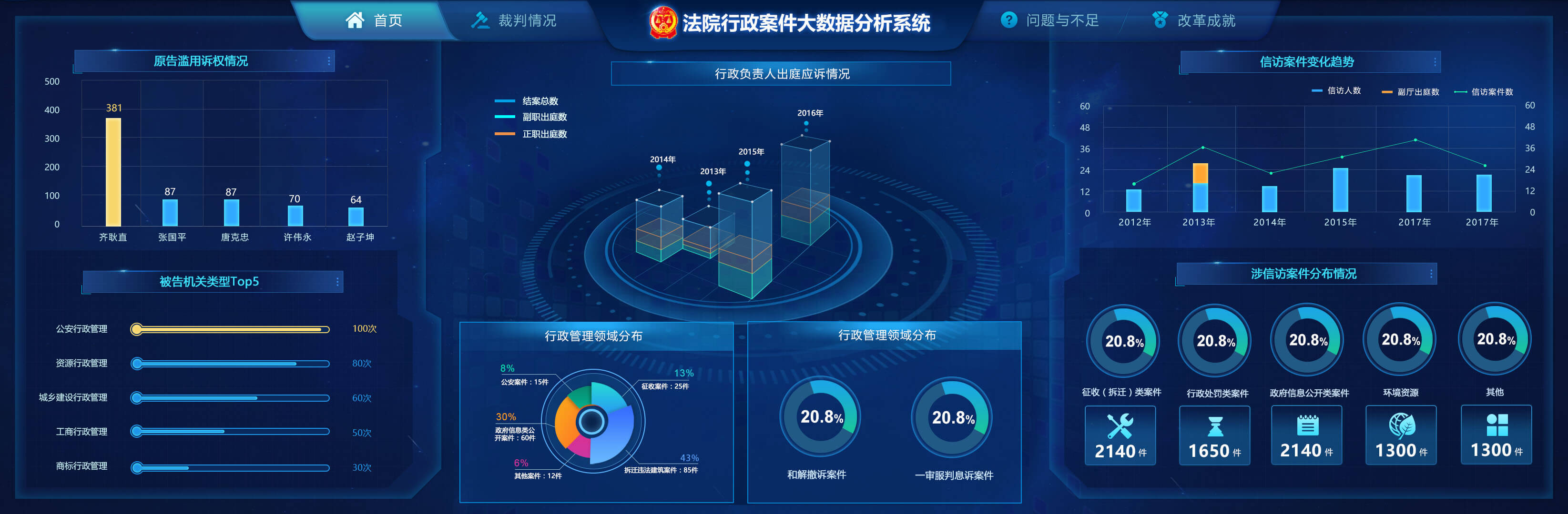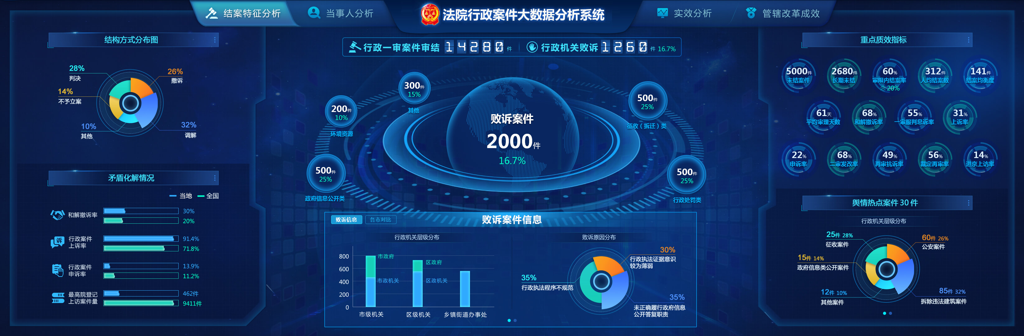法院行政案件大數(shù)據(jù)分析系統(tǒng)包含了結案特征分析、當事人分析、實效分析和管轄改革成效。通過收案/結案的數(shù)量和增幅,分別用時間、領域、地區(qū)等維度分析案件變化趨勢,從結構方式、矛盾化解情況、重點質效指標、輿情熱點案件、敗訴案件和敗訴案件信息來分析結案特征,用信訪案件變化趨勢和分布情況針對機關濫用職權情況來特別分析。不同分析角度分析不同數(shù)據(jù),實現(xiàn)案件大數(shù)據(jù)全方位解讀。